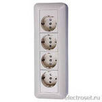 Розетка четырёхместная с заземляющими контактами и защитными шторками используется для подключения бытовых электроприборов к цепи переменного тока. Укомплектована металлической монтажной пластиной для упрощения монтажа розетки на поверхность.